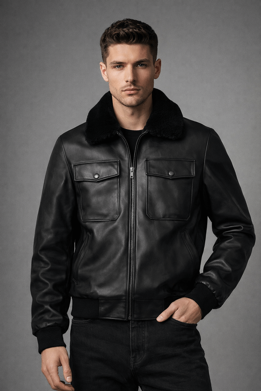 This Black G-1 Flight Leather Bomber Jacket for Men is inspired by iconic military aviation fashion. Designed for men who appreciate classic style with modern comfort.Made from high-quality genuine leather, this jacket features a soft fur-style collar that adds warmth and a bold aviator look. The front zip closure ensures durability and easy wear.Ideal for winter wear, riding, or everyday casual outfits, this G-1 bomber jacket delivers comfort, warmth, and a timeless masculine appeal.