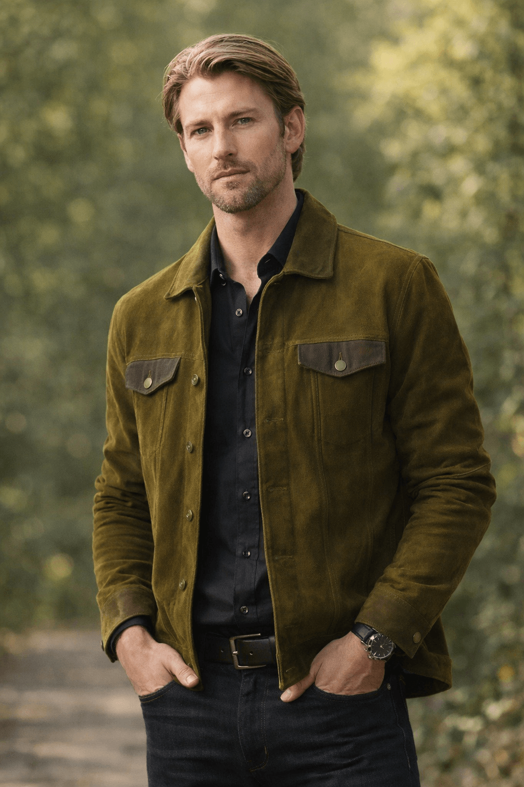 This suede leather jacket is inspired by the stylish on-screen look from the 2024 action-comedy film Hitman. Designed for men who appreciate refined yet rugged fashion, it features a rich olive tone, button-front closure, and a structured silhouette that elevates everyday outfits.