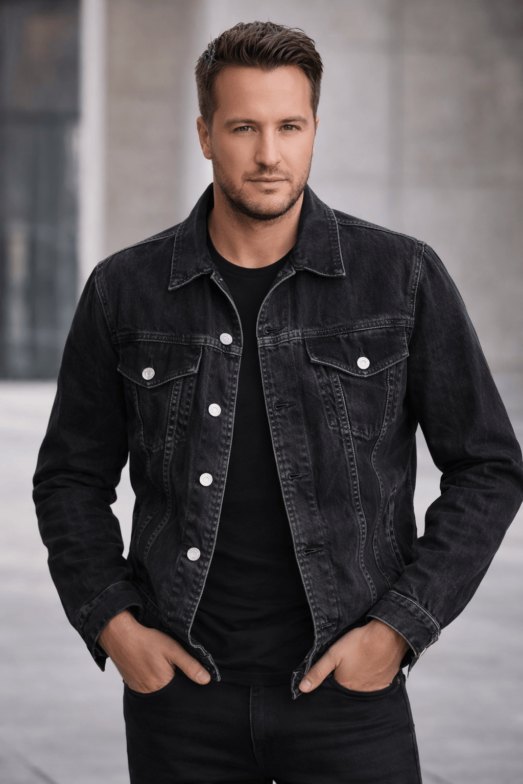 This men’s black denim trucker jacket delivers a bold and confident streetwear look inspired by modern American television fashion. Featuring a structured denim build, button-front closure, and classic chest flap pockets, this jacket reflects the effortless style often worn by judges on popular American musical competition shows.