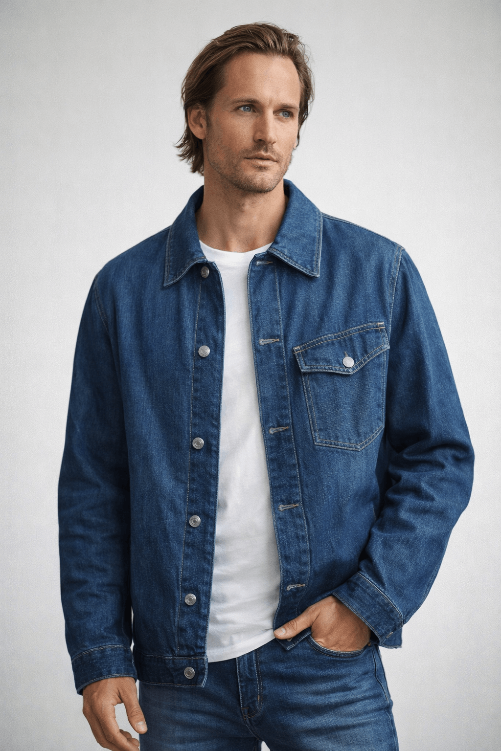 The jacket takes subtle inspiration from the intense, grounded character styling seen in the movie The Moment, reflecting a calm but powerful on-screen presence. Its timeless denim design makes it a versatile choice for casual outings, streetwear looks, or relaxed evening wear without any branding.
