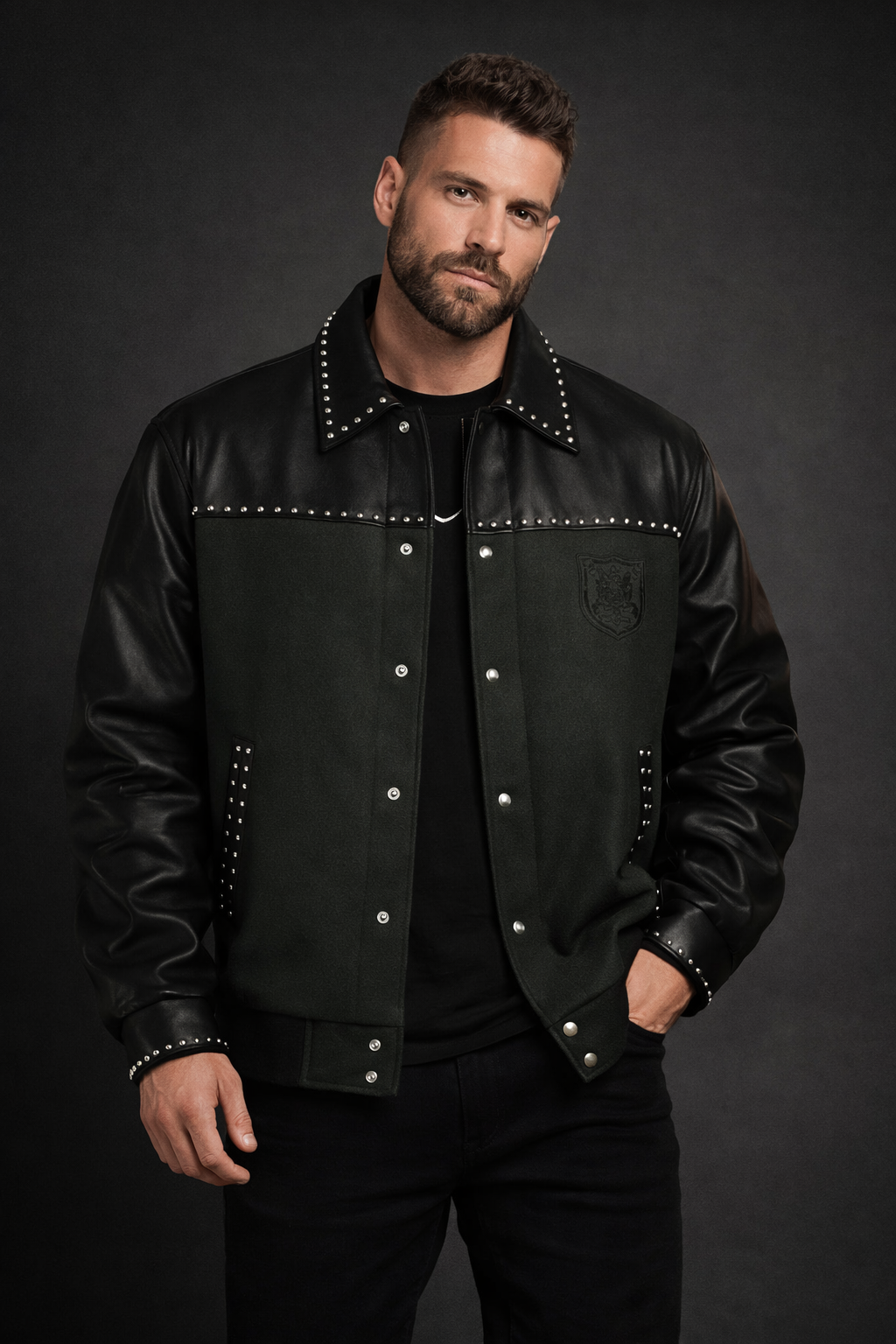 This men’s studded black leather jacket delivers a powerful and edgy look inspired by modern music and performance culture. Crafted with premium leather and detailed with metal studs along the collar and seams, this jacket reflects confidence, attitude, and statement fashion.