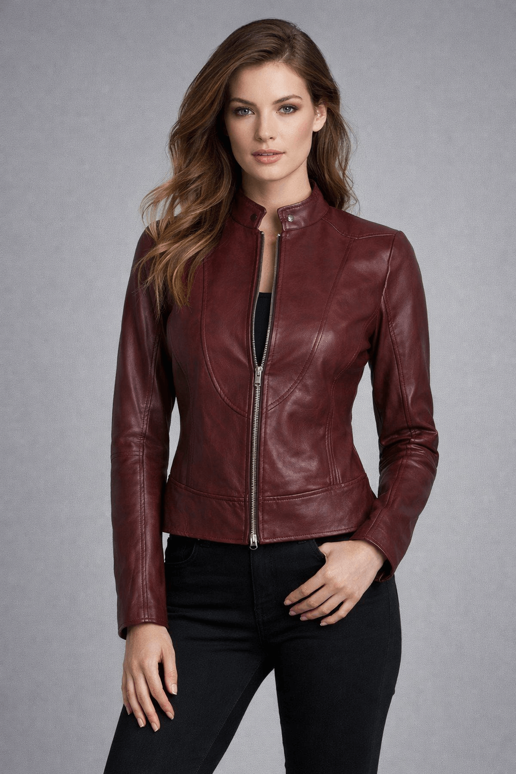 This Women’s Maroon Leather Cafe Racer Jacket is designed for modern women who love a sleek, edgy, and timeless biker look.Crafted from high-quality genuine leather, this jacket features a slim fit silhouette with clean stitching and a smooth front zipper for a sharp cafe racer style.Ideal for biking, street fashion, and everyday casual outfits, this maroon leather jacket adds confidence, comfort, and standout style.